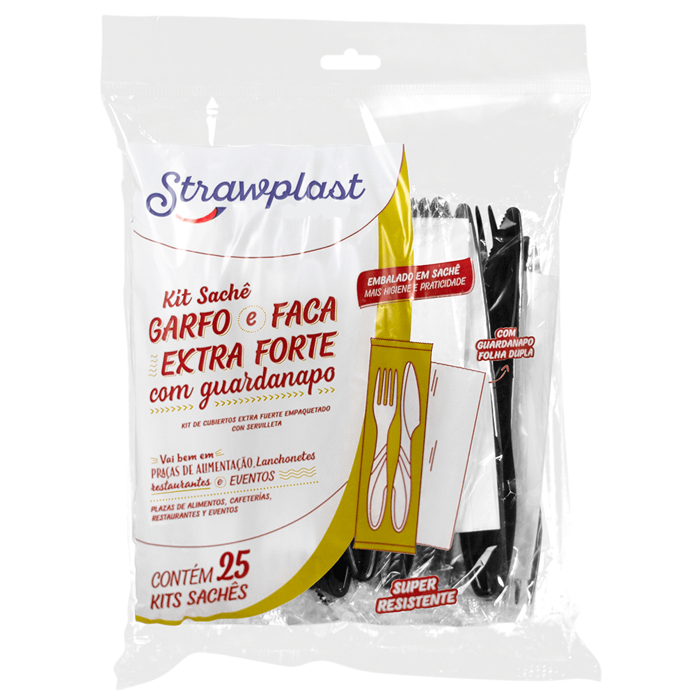 O Kit Sachê Garfo e Faca Extra Forte com Guardanapo Strawplast é perfeito para churrascos, eventos e praças de alimentação! O guardanapo agrega valor ao produto, garantindo qualidade e higiene. Tenha talheres com força, praticidade e robustez para refeições completas!