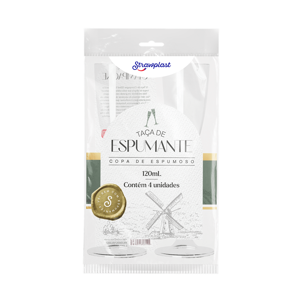 A taça 120ml Champagne Strawplast é fabricada com PS (Poliestireno)