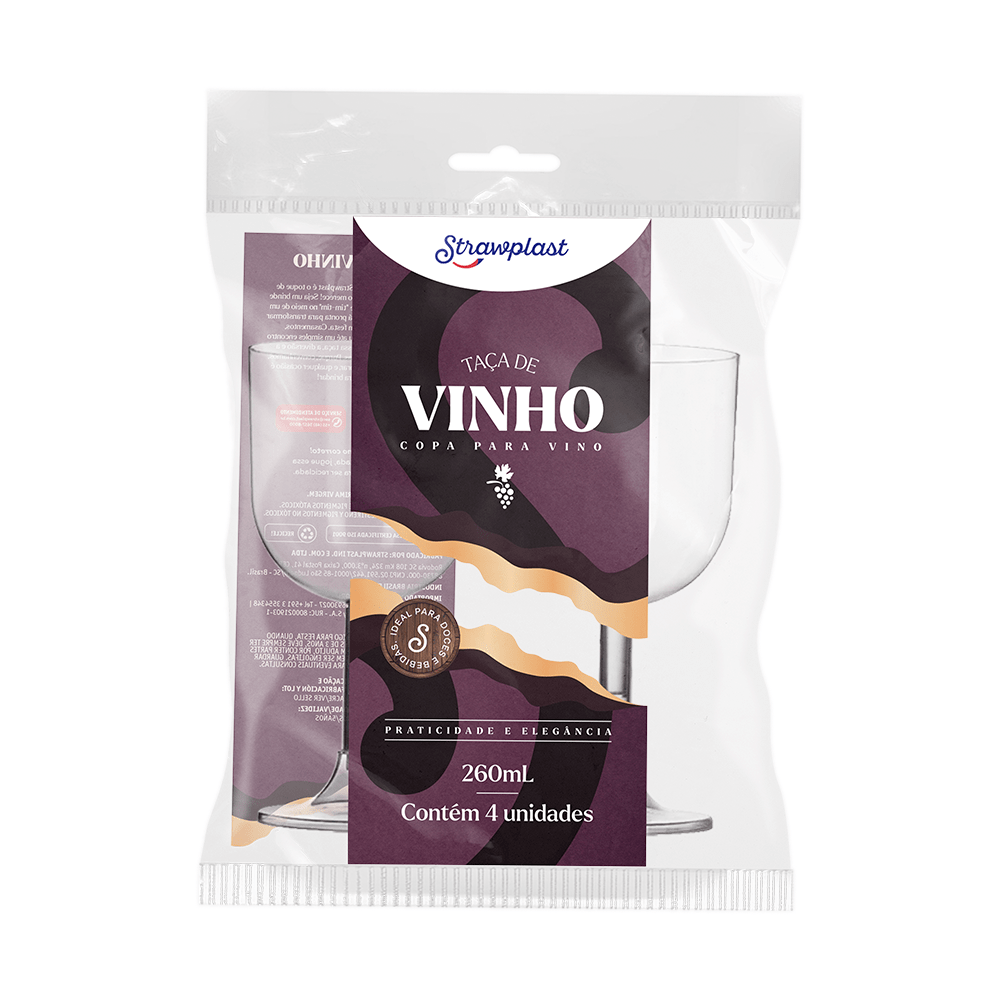 A taça 260ml vinho Strawplast é fabricada com PS (Poliestireno)